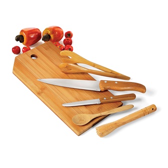 Conjunto para bar em Bambu/Inox. Acompanha faca de 7", faca para frutas 4", colher em Bambu, pilão em Bambu, pegador em Bambu e tábua em Bambu. Tábua confeccionada com tripla camada invertida, para dar maior durabilidade e não deformar com o passar do tempo.