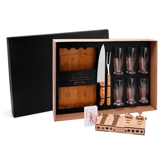 Conjunto para Churrasco / Cerveja. Acompanha tábua com três furos em Bambu; faca 8'' e garfo em Bambu/Inox; seis copos de cerveja em Vidro; caixa para truco com marcador de tentos e jogos em MDF; jogo de cartas. Tábua confeccionada com tripla camada invertida, para dar maior durabilidade e não deformar com o passar do tempo. Rebites em Aço Inox 304, um dos mais resistentes à ferrugem e corrosão.