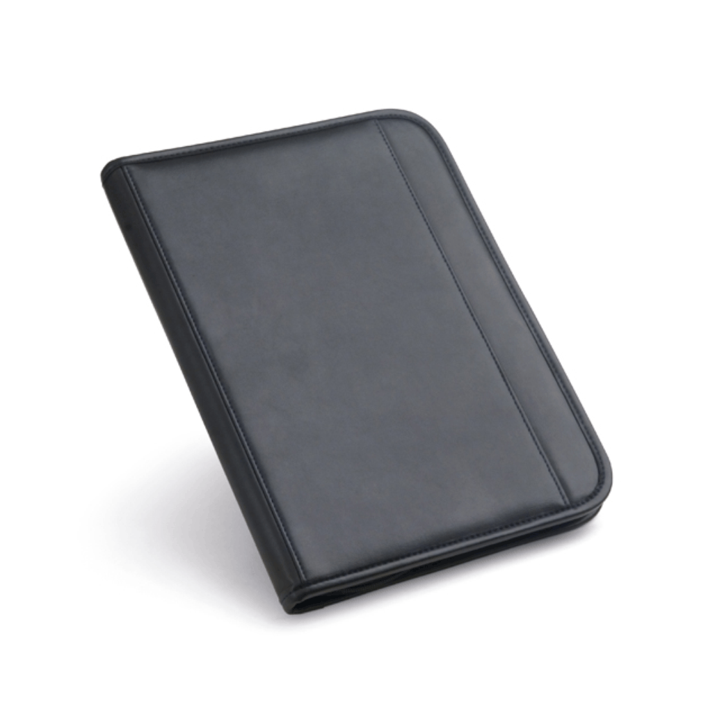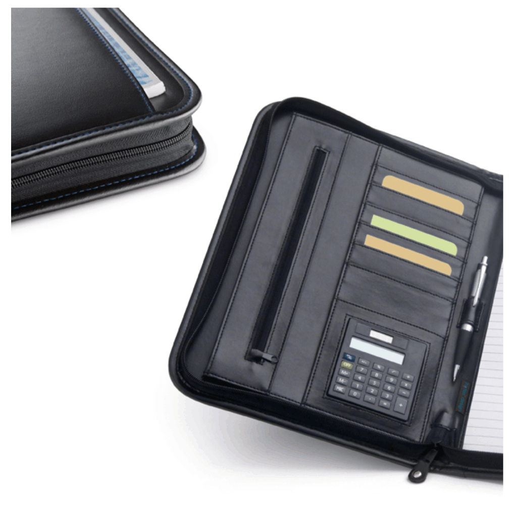Pasta A4. C. sintético. Com bolso frontal. Calculadora dual-power de 8 dígitos. Incluso pilha LR1130. Bloco: 20 folhas pautadas. Esferográfica não inclusa. 250 x 345 x 20 mm
