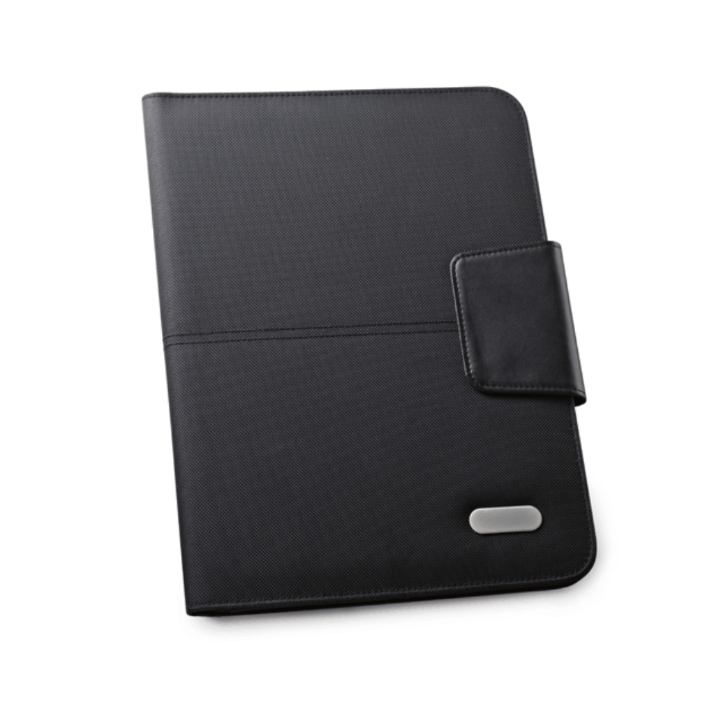 Pasta A4. C. sintético e 1680D. Fecho magnético. Bloco: 20 folhas pautadas. Esferográfica não inclusa. 245 x 325 x 15 mm | Chapa: 45 x 15 mm