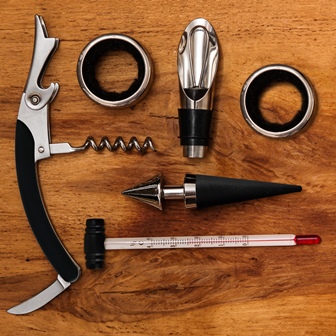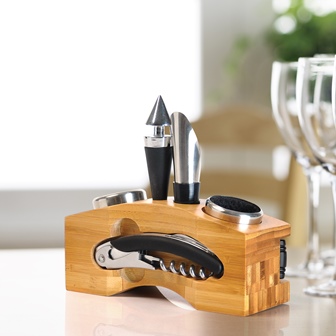 Acessórios para vinho com base em Bambu. Conjunto composto por seis acessórios para vinho confeccionados em metal e aço inox, sendo dois anéis corta-gotas, um funil direcionador com tampa e um tampão, ambos com detalhes emborrachados para melhor fixação na garrafa, um termômetro e um abridor saca-rolhas modelo sommelier de alavanca simples com três funções, tudo perfeitamente acomodados em uma base em bambu. Produtos confeccionados em Bambu