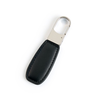 Chaveiro em Metal e Material Sintético preto. Conta com mosquetão e acabamento em costura lateral.
