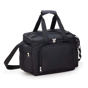 Bolsa Térmica preta em Polyester 600D, 300D e PEVA. Conta com alças de mão, alça de ombro, bolso frontal com zíper, dois bolsos laterais com zíper, elástico superior trançado. Forro interno branco feito de PEVA, atoxico e mais sustentável que o PVC. Tempo de Conservação aproximado: Frio 10 horas / Quente 3 horas.