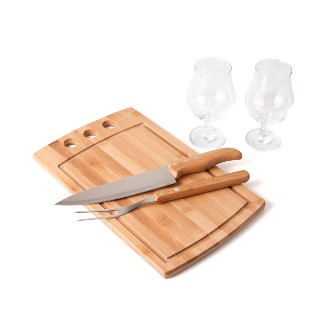 Conjunto para Churrasco / Cerveja. Acompanha tábua com três furos em Bambu; faca 8'' e garfo em Bambu/Inox; duas taças de cerveja em Vidro; espaço para garrafa com palha. Tábua confeccionada com tripla camada invertida, para dar maior durabilidade e não deformar com o passar do tempo. Rebites em Aço Inox 304, um dos mais resistentes à ferrugem e corrosão. Produtos confeccionados em Bambu