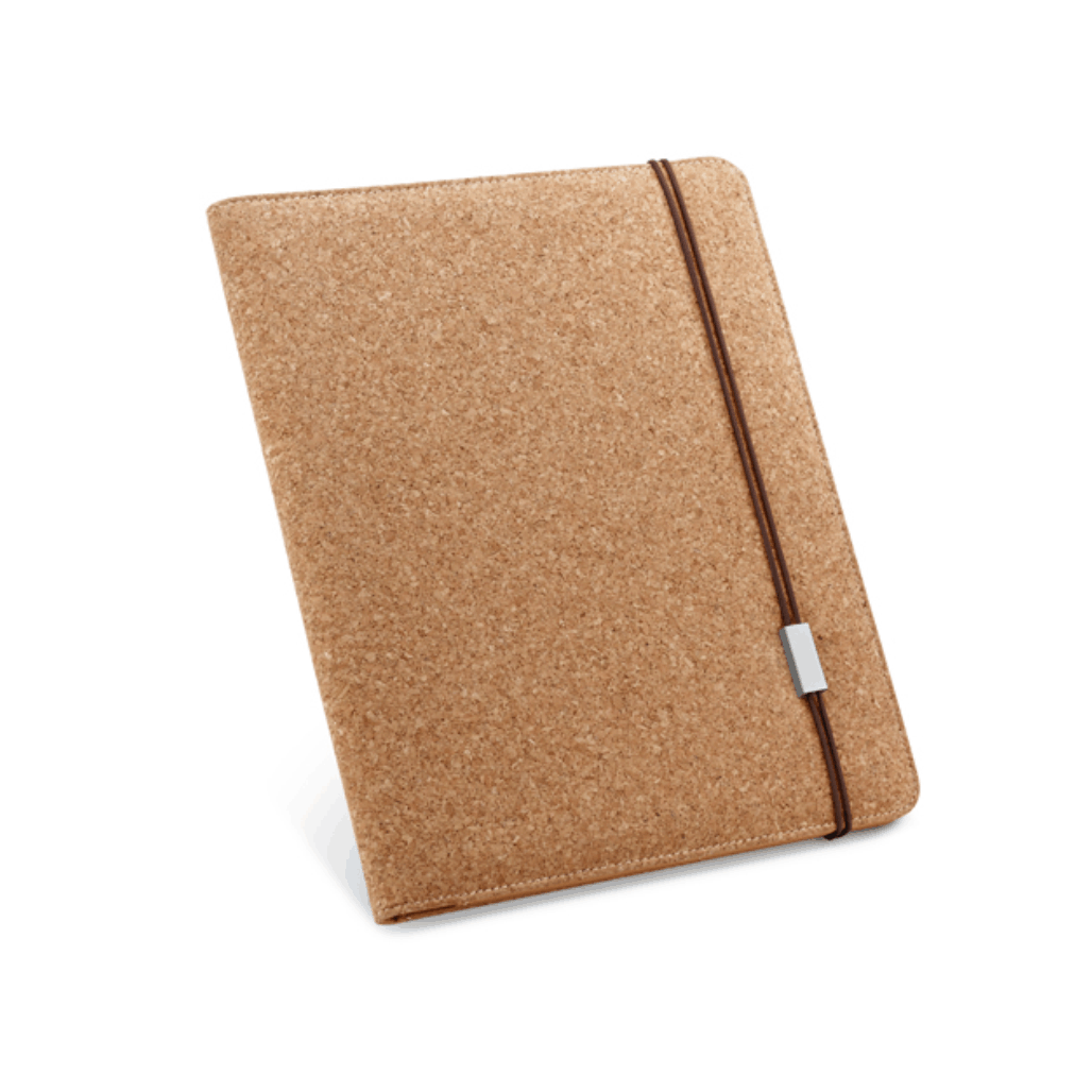 Pasta A4. Cortiça. Bloco: 20 folhas não pautadas cor marfim. Fornecida em embalagem de non-woven. Esferográfica não inclusa. 239 x 307 x 17 mm | Embalagem: 285 x 350 mm