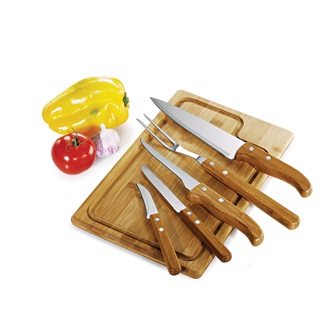 Conjunto composto por uma tábua retangular em tripla camada invertida de bambu com sulco e cinco peças com cabos em bambu e lâminas em aço inox com rebites resistentes, sendo uma faca 7, uma faca 5 para desossar, um garfo trinchante, uma faca 4 de frutas e uma faca 3 de legumes.