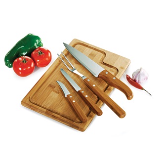 Conjunto composto por uma tábua retangular em tripla camada invertida de bambu com sulco e quatro peças com cabos em bambu e lâminas em aço inox com rebites resistentes, sendo uma faca 7, um garfo trinchante, uma faca 4 de frutas e uma faca 3 de legumes.