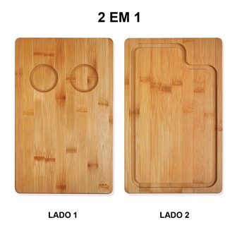 Conjunto para churrasco/ petisco em Bambu/Aço Inox/Porcelana. Conta com tábua e duas espátulas 14cm em Bambu, faca 7" e garfo trinchante em Bambu/Aço Inox e dois ramekins em Porcelana. Tábua confeccionada com tripla camada invertida, para dar maior durabilidade e não deformar com o passar do tempo. Rebites em Aço Inox 304, um dos mais resistentes à ferrugem e corrosão. Capacidade do ramekin: 50ml cada Produto 2 em 1, de um lado da tábua é especifica para churrasco, do outro é ideal para queijos e petiscos. Produtos confeccionados em Bambu