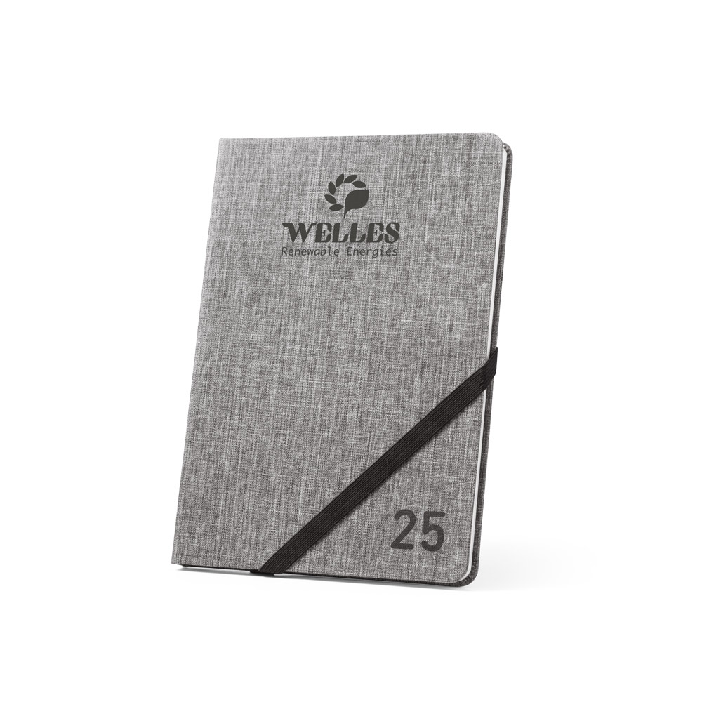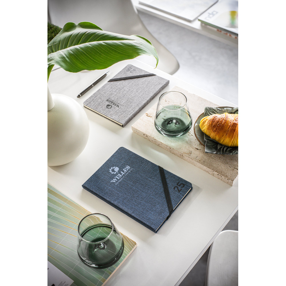 Agenda A5 em 300D PET (100% rPET). Está organizado num plano semanal. Inclui marcador em fita e elástico para fecho na diagonal. 148x210mm
