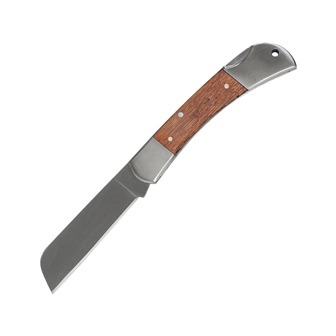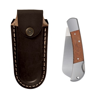 Canivete em Aço Inox com cabo em Bambu. Acompanha bainha em couro com acabamento em costura lateral, aba traseira para cintos e fechamento com lingueta e botão de pressão.