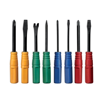 Conjunto composto por oito ferramentas em aço, sendo três chaves de fendas, quatro chaves philips e um extrator de pregos, todas com cabos em polipropileno, acomodados em um estojo com base preta e tampa confeccionada em acrílico transparente. Possui ainda um cabo intercambiável para fixação das chaves e soquete em polipropileno adaptável para porcas borboletas.
