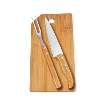 Conjunto composto por uma tábua retangular em tripla camada invertida de bambu com um furo e duas peças com cabos em bambu e lâminas em aço inox com rebites resistentes, sendo uma faca 7 com gravação dos cortes do boi e um garfo trinchante. Produto ecológico.