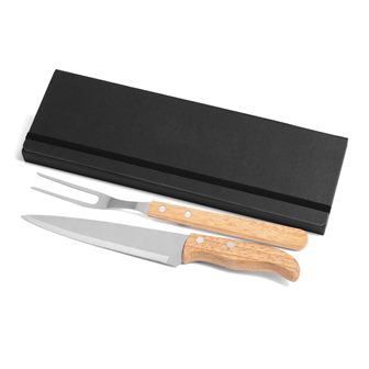 Conjunto composto por uma faca 7 e um garfo trinchante, ambos com cabos em madeira e lâminas em aço inox. Estão organizados em uma pasta preta com elásticos.