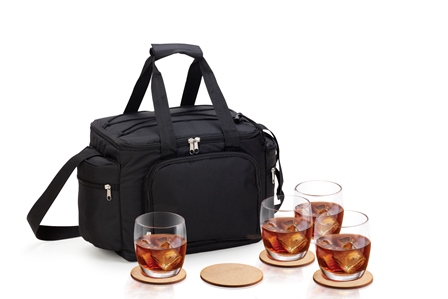 Kit Whisky Conta com bolsa térmica, quatro copos em Vidro e quatro porta copos. Bolsa térmica confeccionada em polyester e revestido em EVA branco a prova dágua, atóxico e mais sustentável que o PVC, possui alças de mão e ombro, um bolso frontal, dois bolsos laterais com zíper e elástico superior trançado. O tempo médio de conservação para frio são de 10 horas, para quente são de 3 horas. Estão perfeitamente acomodados em uma caixa para presentear.